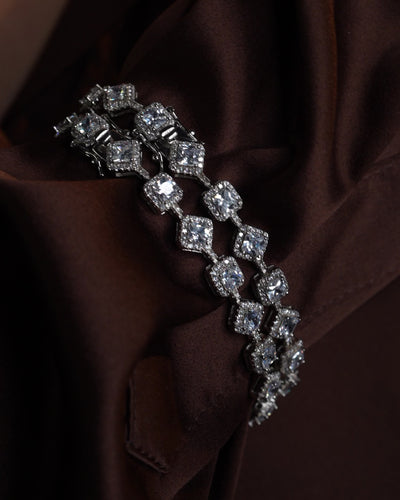 The Dunne is a bold tribute to geometry and glamour. Each link plays with transitions between square and diamond silhouettes, with luminous center stones encircled by pavé- set brilliance. Crafted in refined sterling silver and precision-cut cubic zirconia, it captures the drama of fine jewelry while remaining endlessly wearable.