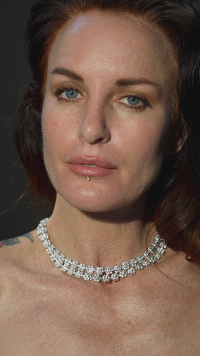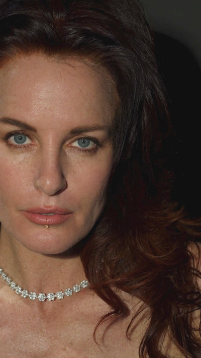 The Godfrey Allure Juliette Floral Rivière necklace (15", sterling silver) blossoms with timeless enchantment. Each precision-cut cubic zirconia is crafted as an ethical alternative to mined diamonds, capturing the fire and brilliance of fine jewels without compromise. Draped in luminous sterling silver, the rivière wraps the neck in a garden of soft, whispered sparkle –– romantic, feminine, unforgettable.