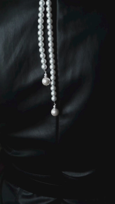 The Miriam 45 - inch pearl lariat is a graceful ribbon of 8 mm round pearls and 12 mm oval pearls, artfully strung to create movement, contrast, and rhythm. Each end of the strand is crowned with a sterling silver cap encrusted with sparkling cubic zirconia, adding a radiant finishing touch to a piece that's equal parts vintage glamour and modern statement.